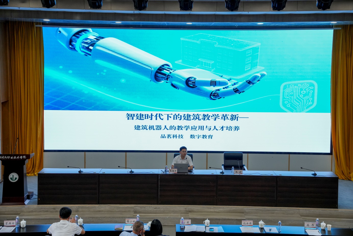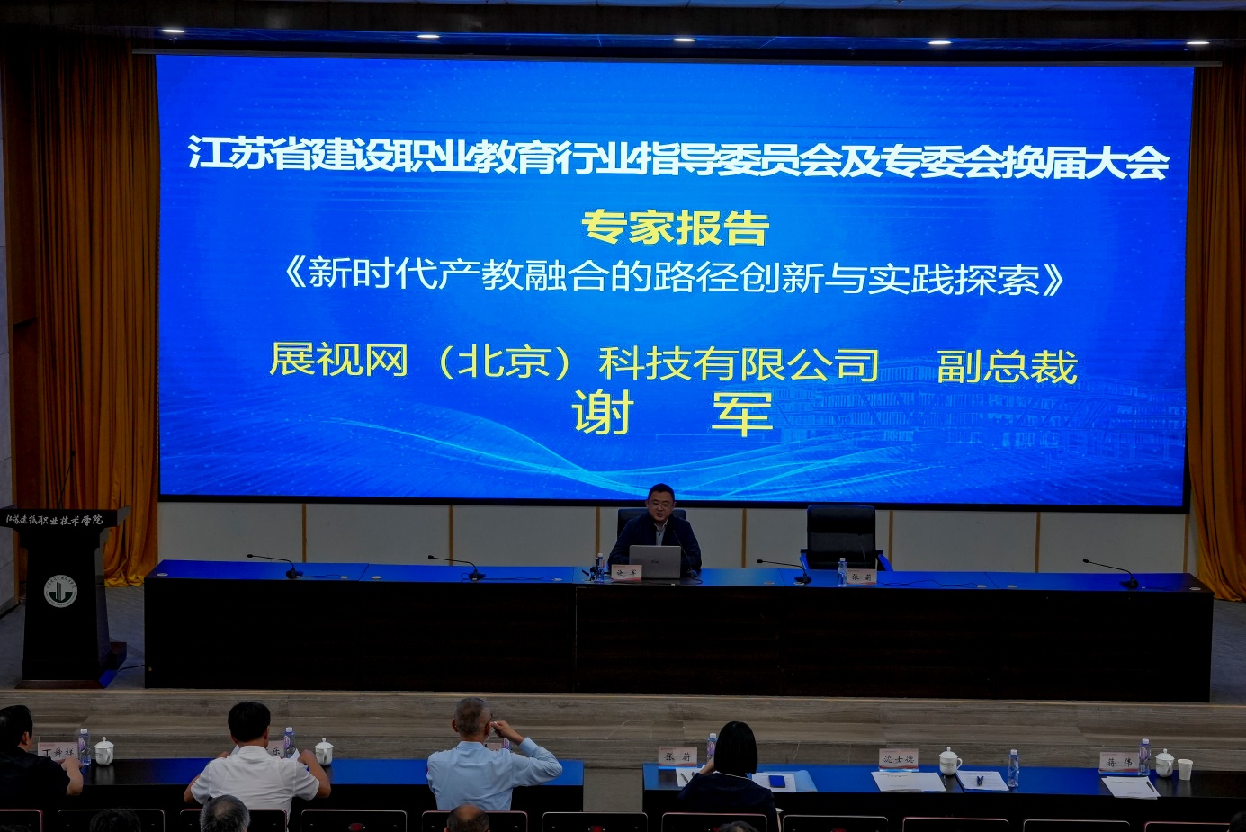 换届大会第一阶段由学校校长沈士德主持,学校党委书记朱东风致欢迎辞,章小刚作省建设行指委第一届工作总结,郝高峰宣读《省教育厅关于公布新一届江苏省职业教育行业指导委员会(2025-2028年)主要组成人员名单的通知》换届文件和新一届省建设行指委组成人员名单,曹云华宣读专委会换届文件,张钧作总结讲话,会议还颁发了新一届省建设行指委和专委会的聘书。换届大会第二阶段是专家报告,会务组邀请常州工程职业技术学院原党委书记袁洪志作《江苏省高等职业教育专业认证土木建筑大类专业补充规范介绍》,展视网(北京)科技有限公司谢军作《新时代产教融合的路径创新与实践探索》,品茗科技股份有限公司朱海舟作《智建时代下的建筑教学革新一建筑机器人的教学应用与人才培养》,广联达科技股份有限公司杨巍作《把握建筑业转型趋势,探索新机遇下的人才培养》,中国建设劳动学会副秘书长高清禄作题为《基于大数据驱动双主体育人适配下的专业建设思考与实践》,中建电子信息技术有限公司李健作《智慧运营运维及能碳管理平台开发》。随后,进行了专委会分组会议,集中研讨省建设行指委和专委会的三年工作计划讨论稿。