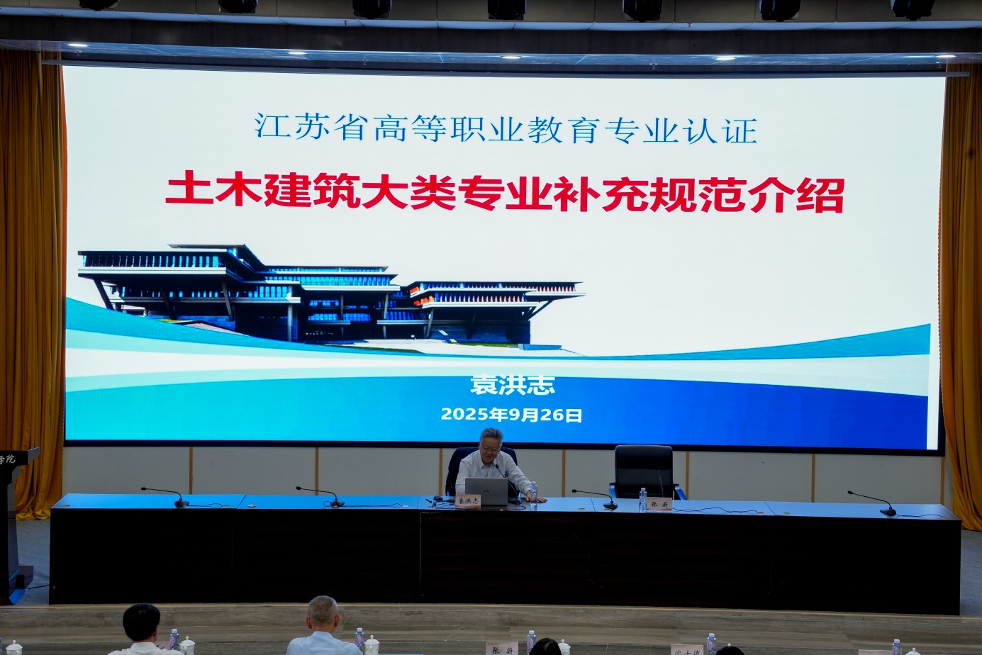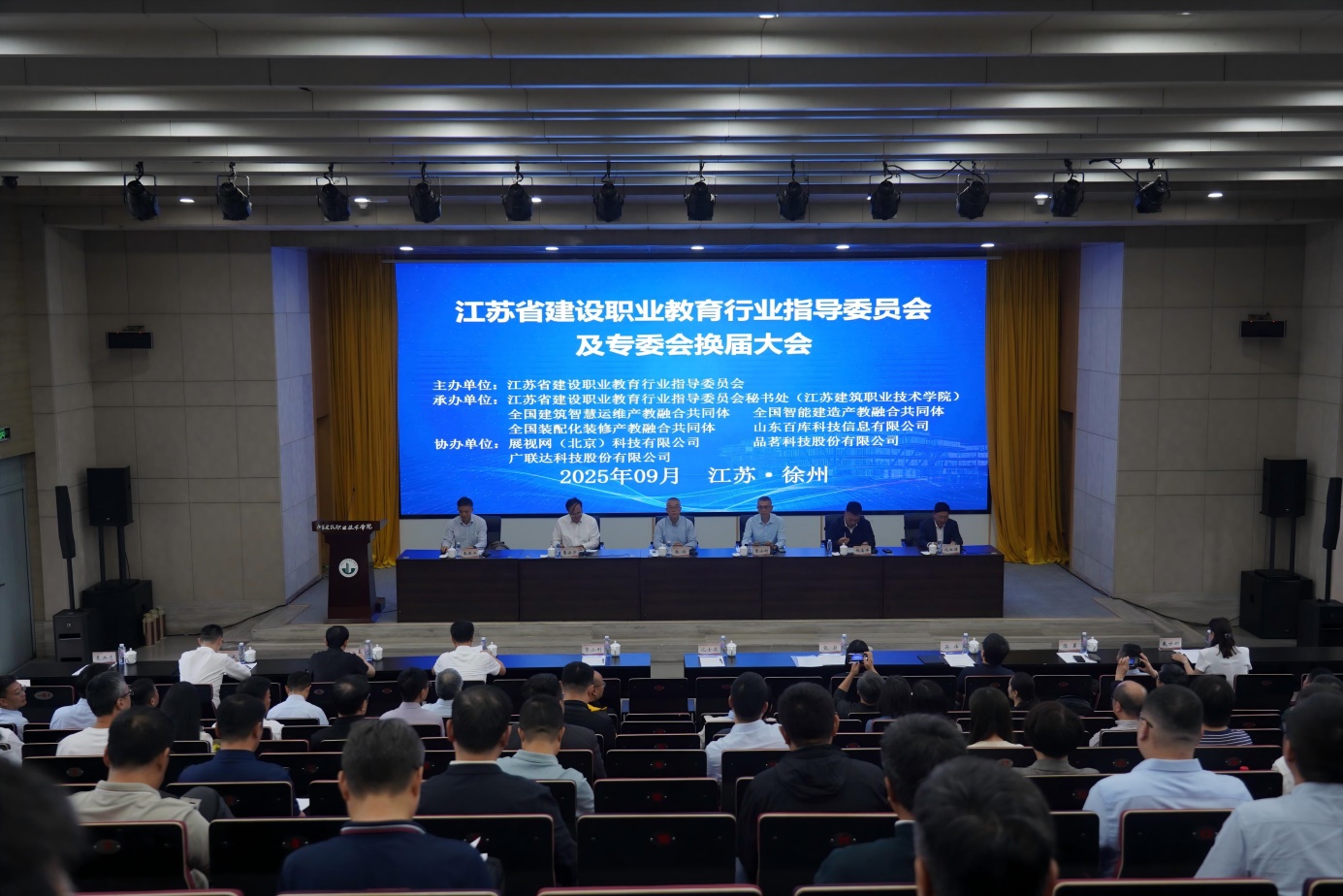 9月26日,江苏省建设职业教育行业指导委员会(以下简称“建设行指委”)及专业委员会(以下简称“专委会”)换届大会在我校召开。会议由江苏省建设职业教育行业指导委员会主办,省建设行指委秘书处江苏建筑职业技术学院、全国建筑智慧运维产教融合共同体、全国智能建造产教融合共同体、全国装配化装修产教融合共同体、山东百库科技信息有限公司承办,展视网(北京)科技有限公司、品茗科技股份有限公司、广联达科技股份有限公司协办。出席换届大会的领导有江苏省住房和城乡建设厅副厅长、省建设行指委主任委员张钧,江苏省住房和城乡建设厅原二级巡视员、省建设行指委原主任委员章小刚,江苏省住房和城乡建设厅二级巡视员人事教育处处长、省建设行指委副主任委员曹云华,江苏省教育厅职教处副处长郝高峰,学校党委书记朱东风;参加会议的有新一届省建设行指委组成人员,各专委会的组成人员,全省开设建设类专业院校有关领导和专业负责人等,共计110余人。